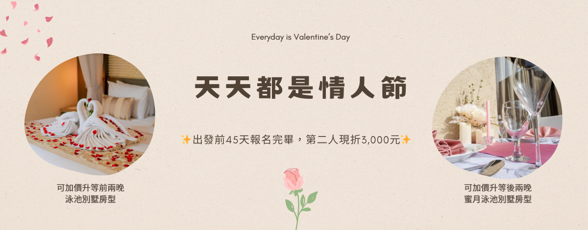 天天都是情人節2.0 早鳥優惠價 出發前45天預訂 每人最低只要16,400元 起 (不含機票)